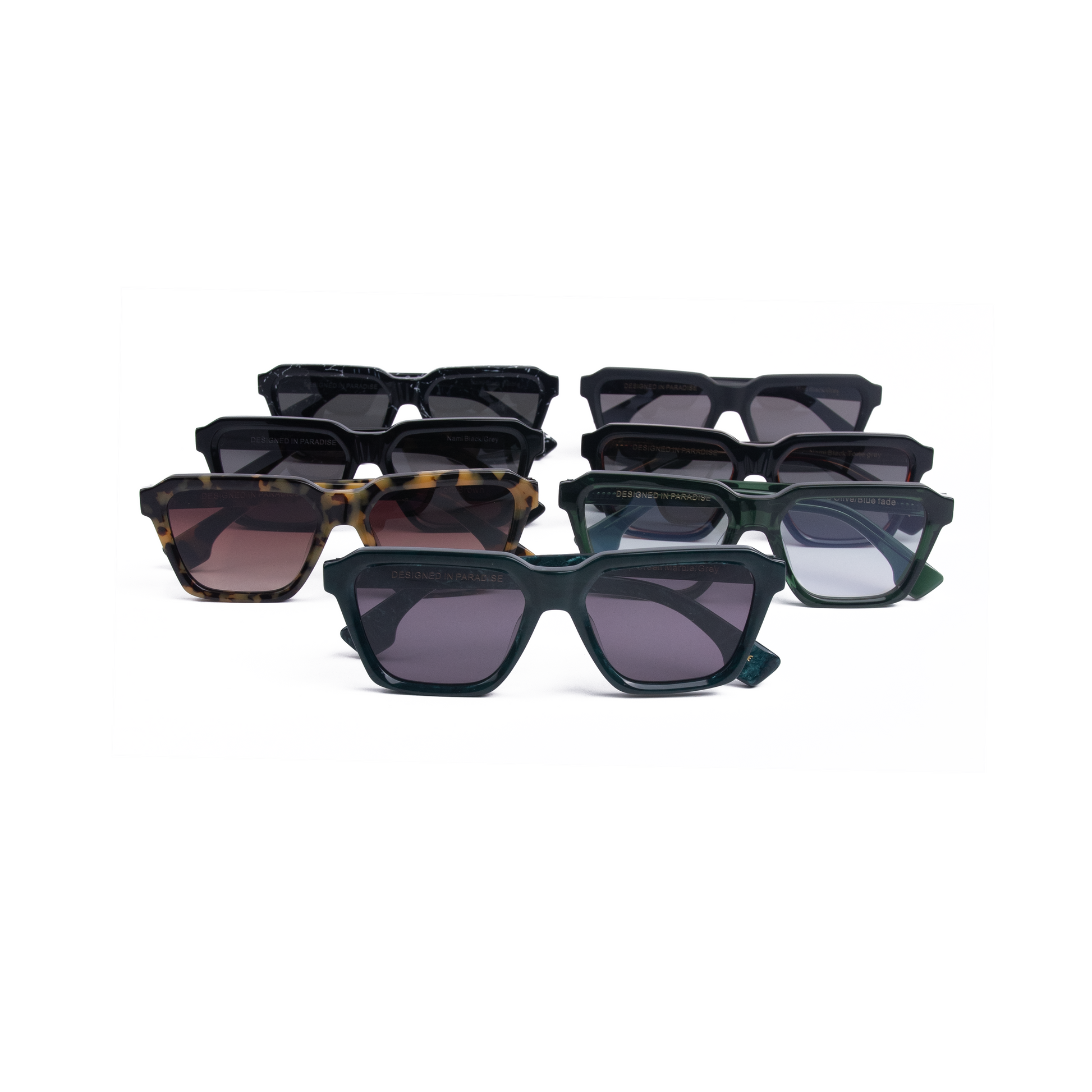 Our NAMI model comes in matt black, black, deep green marble, black marble all grey glasses. NAMI is also available in havana tort with brown glasses, deep green marble with blue glasses and black marble with black glasses