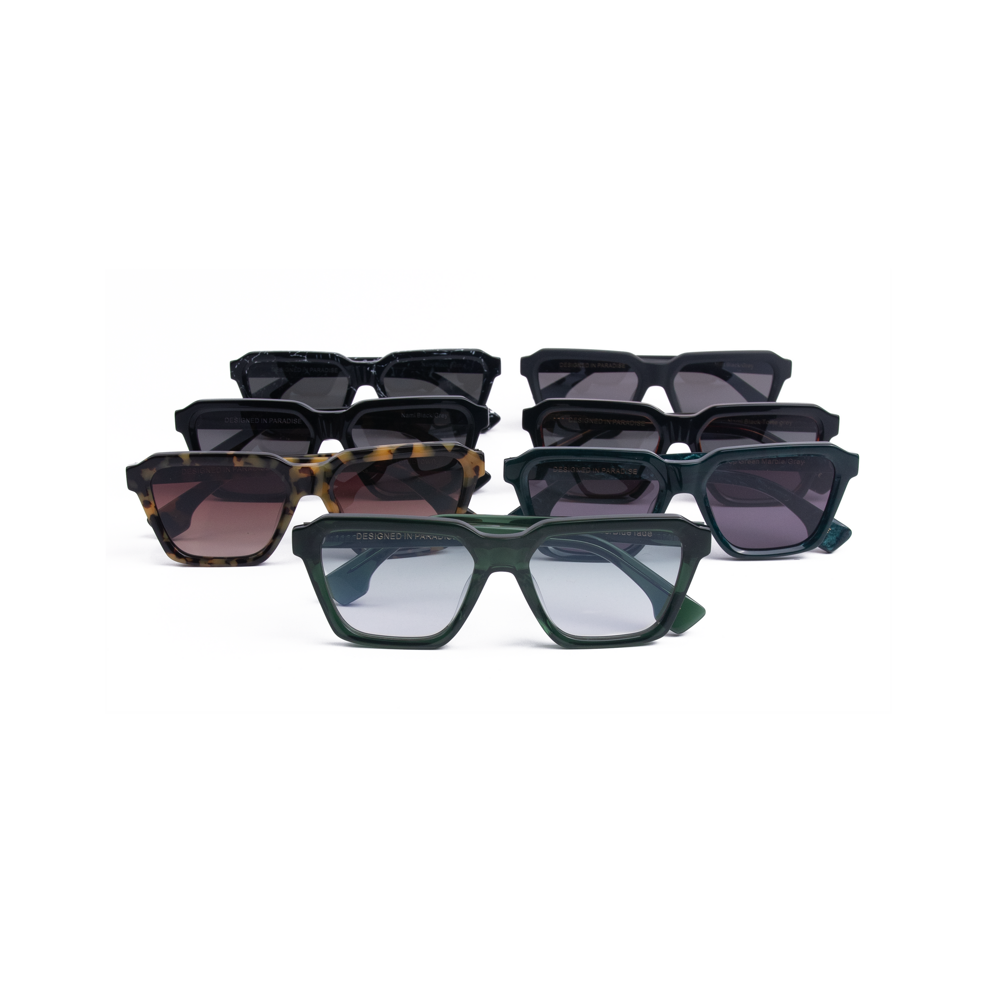 Our NAMI model comes in matt black, black, deep green marble, black marble all grey glasses. NAMI is also available in havana tort with brown glasses, deep green marble with blue glasses and black marble with black glasses